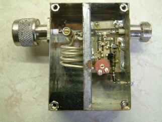 In the above picture, the MGF1302 can be recognised were it is soldered with the two source-leads to the 1nF trapezium capacitors. The two variable high-Q capacitors gives the PreAmp possibillities to optimize for NF-factor and Gain.