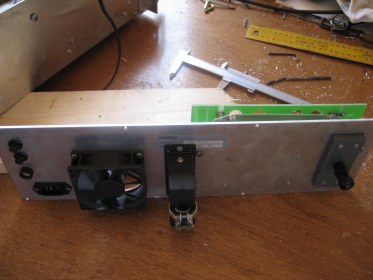In the two above pictures are respectivily the front-, and rearpanel shown. The rearpanel hold three fuses, a small 12V blower that, in case of too warm transformer can be switched ON. Until today this blower is not been needed, even during extensive transmit periods during JT65b and using well over 1kW of RF output signal.